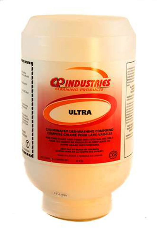 A heavy-duty chlorinated dish machine compound, buffered to control water hardness from 0-35 grains hardness. Ultra eliminates scale in the wash tank, is buffered against the etching of glassware and effectively prevents hard water build-up on dishes and glassware in extremely hard water areas. Ultra will extend the life of dish machine tanks and will absorb up to 20% to 25% more soils than the majority of dish compounds. Consequently, it offers extended mileage which reduces the cost factor by up to 15%.